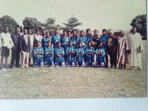 For the Good of Women’s Football…Female Football Interest Group (FFIG) All Star FC sponsored by some patriotic Nigerian journalists and coaches to provide strong force to push Super Falcons to perfection in 1990s and beyond. Members include Harry Awurumibe (in suit), Dapo Sotiminu, late Henrietta Ukaigwe (Ankara gown) and Coach Rowlanson Odeh (far right). Picture taken before Super Falcons vs FFIG All Star match at Obasanjo Farms Hotel pitch in Otta, Ogun state in 19991.
